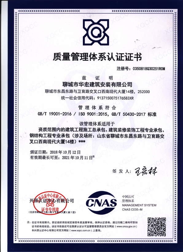 聊城市華宏建筑安裝有限公司成立于2002年5月,公司自2002年成立以來,不斷發(fā)揚 “敬業修身 打造精品 開拓創(chuàng)新 弄潮勇進”的創(chuàng)業精神,始終遵循“以質量求生存、靠精品創(chuàng)品牌、憑信譽贏市場”的宗旨,認真奉行“科學 高效 一流”的質量方針